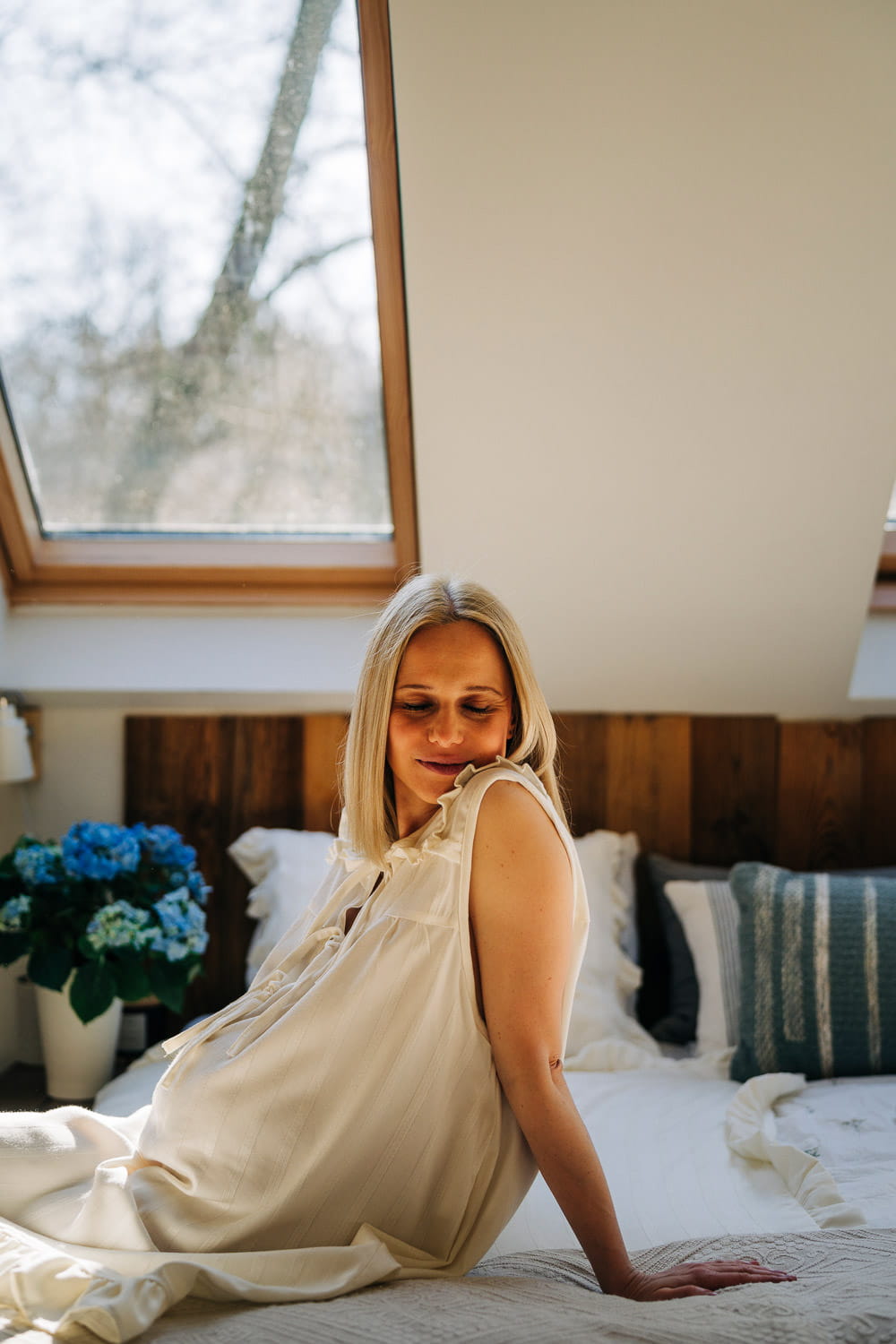 Romantyczna koszula nocna dla Mam, zaprojektowana tak, aby towarzyszyć Ci zarówno w czasie ciąży, jak i w pierwszych tygodniach z maluszkiem. Swobodny krój pięknie układa się na ciążowym brzuszku, a później zapewnia wygodę podczas karmienia. Delikatna falbanka, subtelne detale i oddychająca tkanina bambusowa nadają jej lekko retro i bardzo kobiecy charakter.