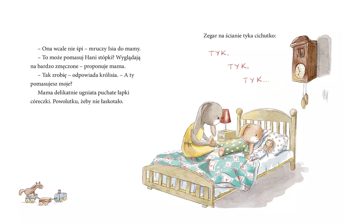 Isia mieszka w przytulnym domku z mamą, tatą i swoją ukochaną lalką Hanią. Jak to często bywa, mała króliczka ma własne zdanie – i to na wiele tematów! Dziś na przykład postanowiła, że wcale nie pójdzie spać. Gdy jednak mama zwraca uwagę, jak bardzo zmęczona jest Hania i że jeśli nie odpocznie, może jutro nie dotrzeć na herbatkę u misiów, Isia bierze sprawy w swoje łapki...
