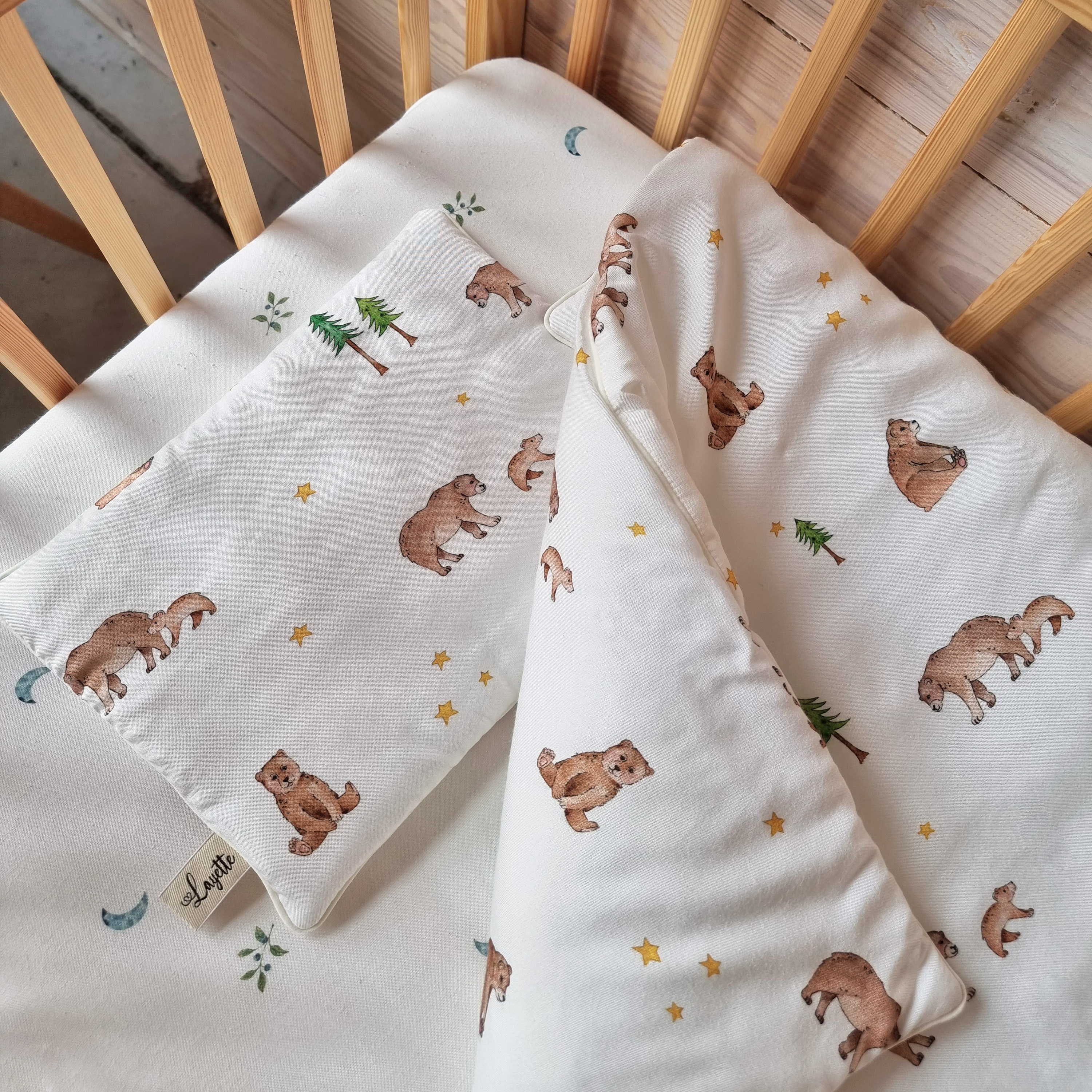 Komplet dwustronnej pościeli bambusowej z płaską poduszką dla niemowlaka z antyalergicznym wypełnieniem dedykowania dla dzieci od urodzenia do 2,5 roku.